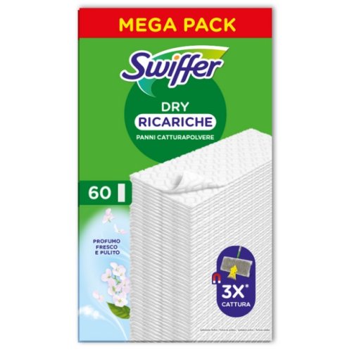 Il Mega Pack Swiffer Dry Ricariche offre un’ampia scorta di 60 panni catturapolvere profumati, ideali per una pulizia completa e duratura della casa. Grazie alla tecnologia elettrostatica 3X Capture, questi panni catturano fino a tre volte più polvere, peli e sporco rispetto ai panni tradizionali, garantendo superfici pulite e senza aloni.
