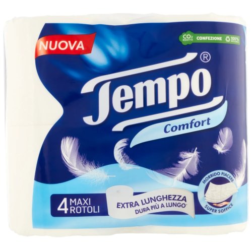 Tempo Comfort è la carta igienica ideale per chi cerca un’esperienza di utilizzo superiore, unendo morbidezza e resistenza in ogni foglio. La confezione contiene 4 maxi rotoli, ciascuno con una lunghezza extra, per una durata superiore rispetto ai rotoli standard.