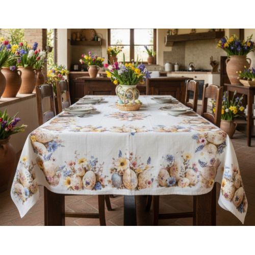 Trasforma il tuo pranzo di Pasqua in un evento indimenticabile con la tovaglia Tiffany di Vingi Ricami. Il Disegno 2 (codice P7892) è una celebrazione della rinascita primaverile: una raffinata stampa digitale piazzata che accosta delicati motivi floreali a simboli iconici della Pasqua, creando un’atmosfera gioiosa e sofisticata.
