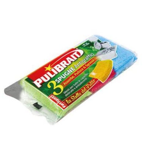 Il Pulibrait tris spugne antigraffio colorate art.45687 è un set di spugne per la pulizia domestica, progettate per essere efficaci contro lo sporco ma delicate sulle superfici, grazie al loro strato abrasivo "antigraffio".