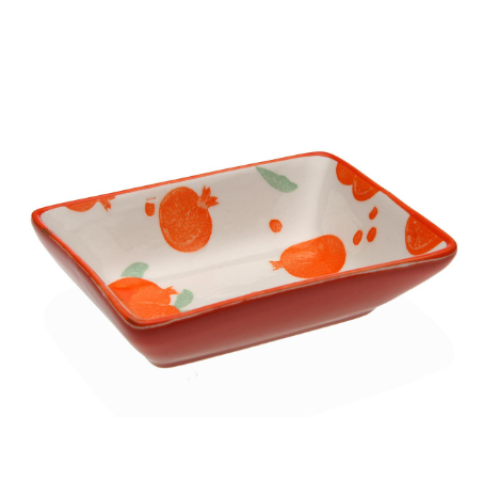 E' una ciotolina rettangolare in ceramica decorata, probabilmente adatta per servire antipasti, salse, olive, o piccoli contorni.