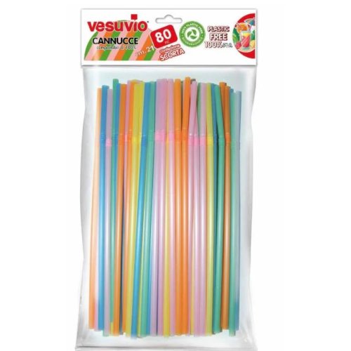 Le Cannucce in Plastica Vesuvio in confezione da 80 pezzi (Art. 00540) sono cannucce monouso, spesso colorate, ideali per l'uso con bevande fredde e calde in occasioni come feste, picnic o l'uso quotidiano.