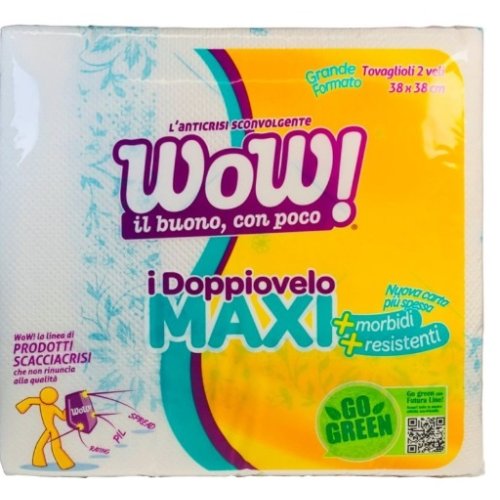 I WOW Tovaglioli Maxi 38x38 sono tovaglioli di grande formato, pensati per offrire resistenza, assorbenza e comfort durante l'uso quotidiano o in occasioni speciali. Con le loro dimensioni generose di 38x38 cm, questi tovaglioli sono ideali per chi cerca un prodotto versatile, capace di soddisfare esigenze di pulizia, ma anche di eleganza sulla tavola.
