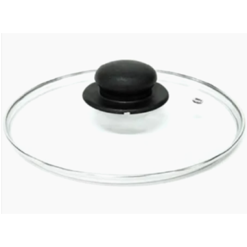 Coperchio in vetro temperato con bordo in acciaio inox e valvola sfiato vapore, manico in plastica nero con placca di protezione per le dita.